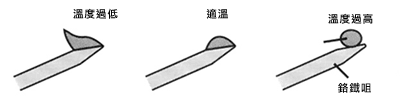 錫是低溫易熔及易老化的焊料,溫度低時,錫呈現(xiàn)膠狀不黏,令線路 板的銅箔與零件腳造成假焊。溫度正確適中時,在焊咀的錫呈半圓粒狀,有反光面,是黏著力最佳的時候,迅速將零件腳與底板電路焊接。溫度過高時,錫呈圓粒 狀,錫點表面的色澤呈啞色,有縐紋,表示錫已老化,會造成假焊點出現(xiàn)。所以,從鉻鐵咀的錫粒形狀可知何時焊接是最好的時候,制作的成功率是怎樣。