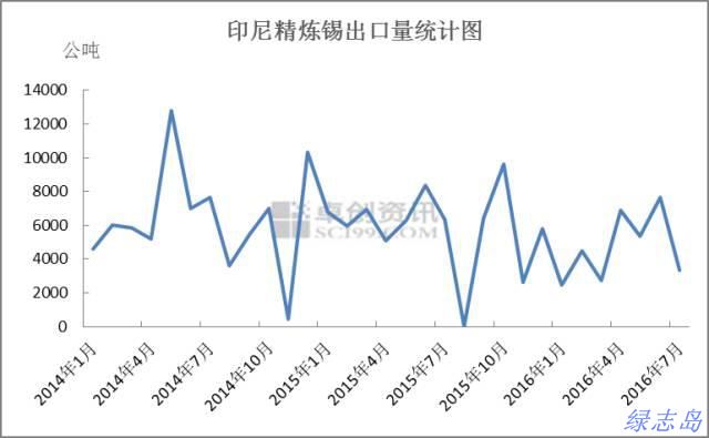受印尼出口政策的影響,近幾年,印尼的精錫出口量逐漸降低,2016年7月印尼精煉錫出口量為3313.05公噸,較上月減少了4338.79公噸,環(huán)比減少56.70%,較去年同期減少3016.87公噸,同比下降47.66%。2016年1-7月總出口量為32963.5公噸,較去年同期減少12723.6公噸,同比下滑27.85%。如此大幅度的下滑,很大程度上牽制了全球精煉錫的供應(yīng),使得倫錫庫(kù)存持續(xù)處于低位。截止今年8月末,倫錫庫(kù)存為4460公噸,較去年同期減少2520公噸,同比下降36.10%。